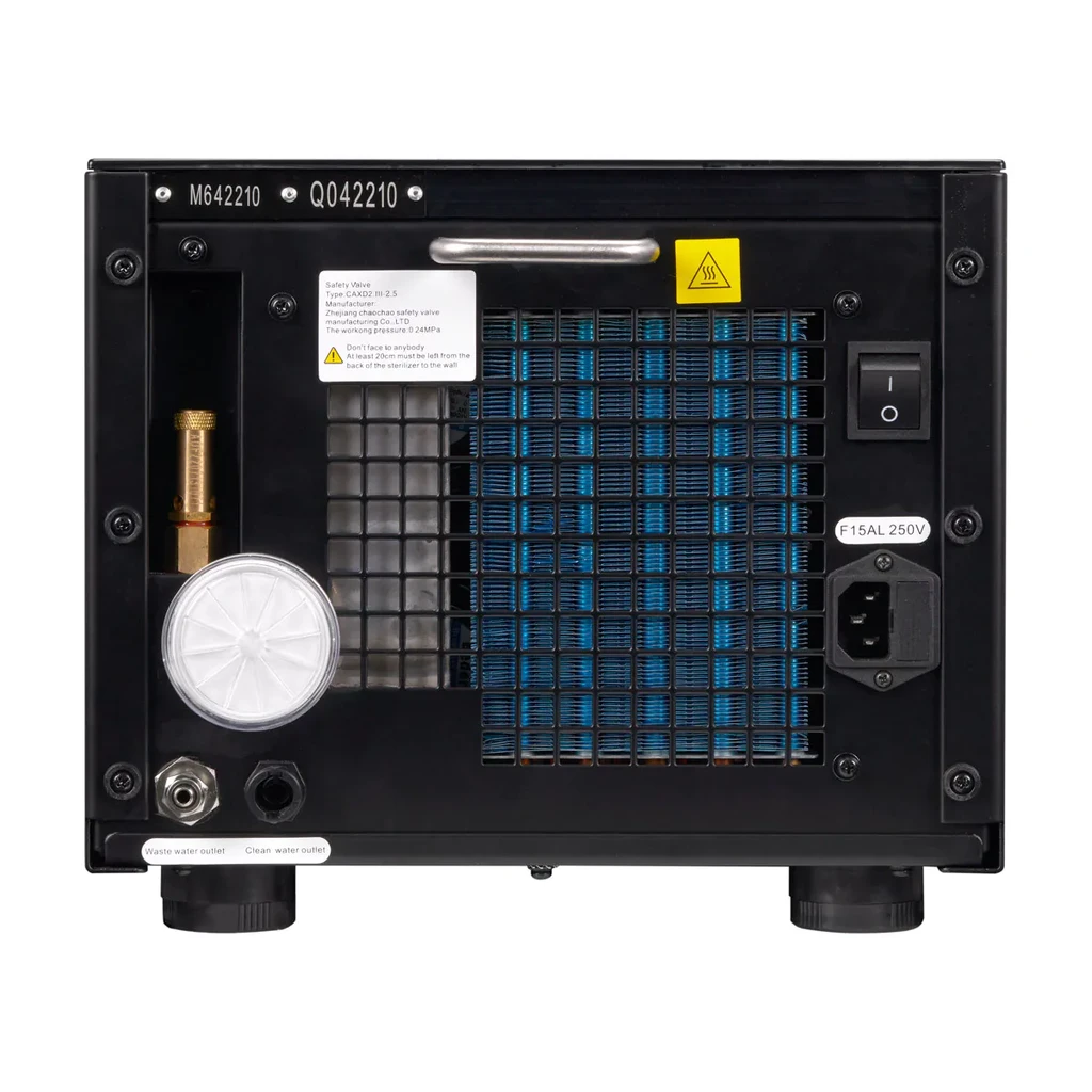 Il dispositivo è dotato di un serbatoio integrato per acqua pulita e pertanto non è necessario collegare un serbatoio esterno con i relativi problemi. Ogni sterilizzazione eseguita viene automaticamente salvata nella memoria della scheda SD. Il ciclo più breve per strumenti senza imballaggio è di 9 minuti, asciugatura inclusa.