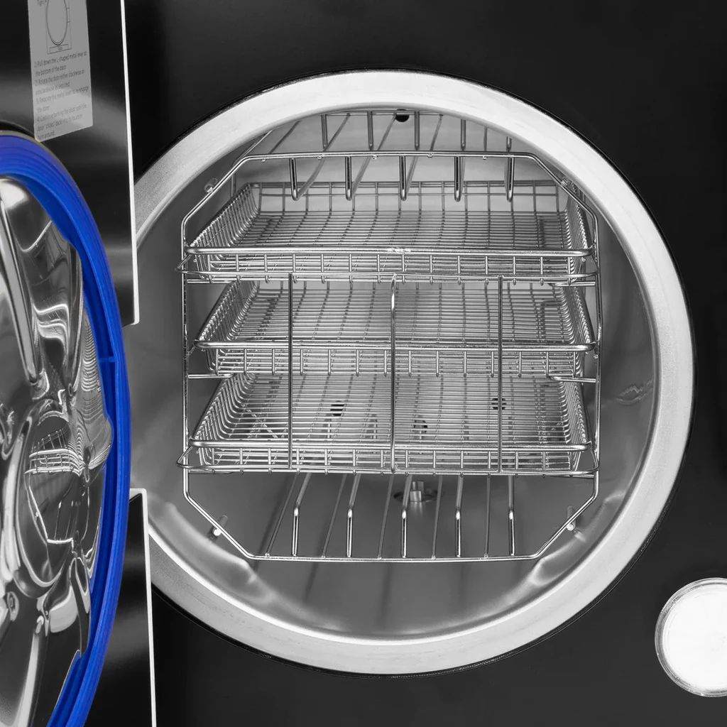 Il set include: autoclave, tubo di scarico, cestello con 3 vassoi, cavo di alimentazione, supporto per vassoi, supporto per la rimozione dei vassoi, fusibile, manuale in inglese e passaporto tecnico.