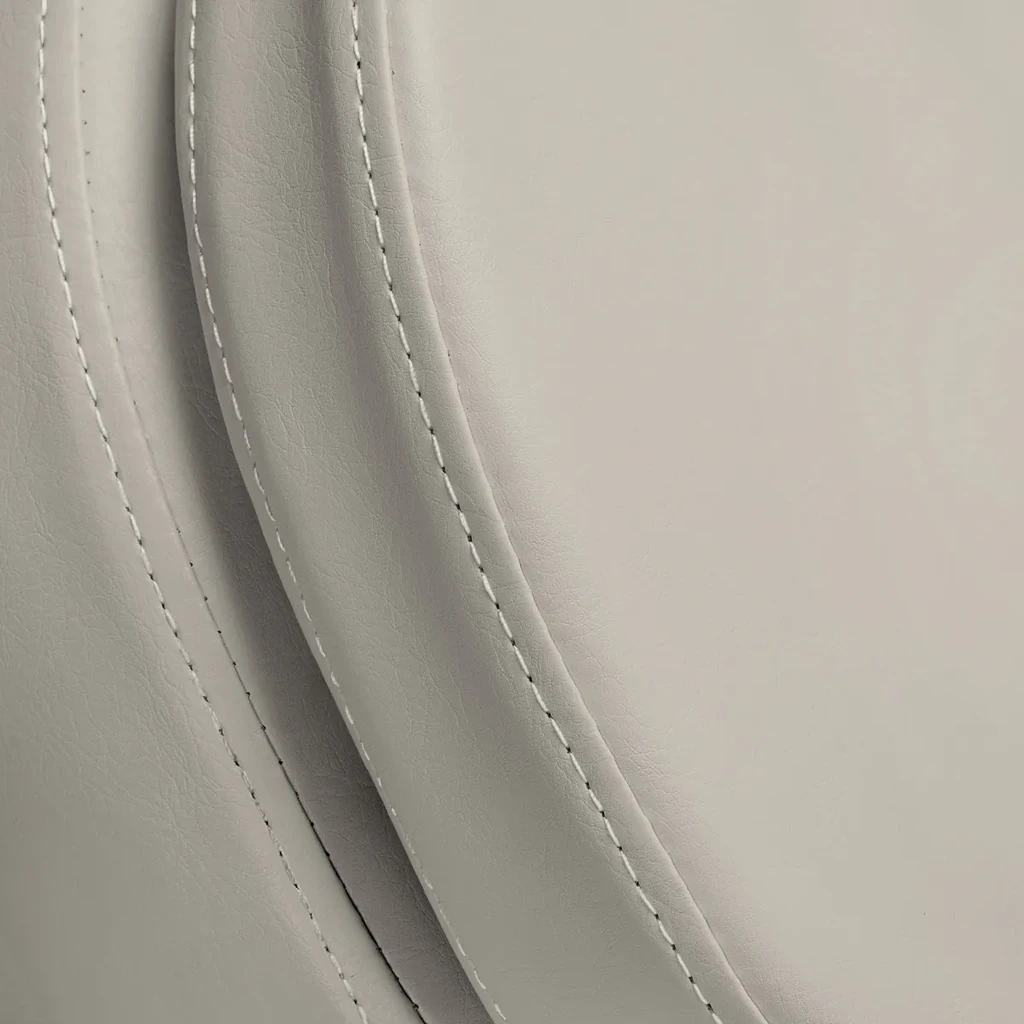 Rivestita in elegante pelle sintetica color sale marino e con una base bianca stabile, la poltrona trasmette eleganza e resistenza.