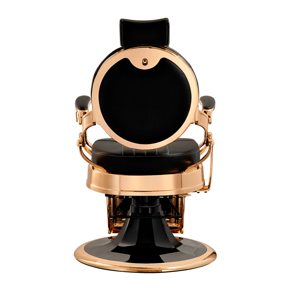 Poltrona da barbiere di lusso, progettata per coniugare stile e comfort. La poltrona ha una robusta struttura interamente in metallo pressofuso, che offre la massima stabilità e durata. L'elegante finitura cromata dorata esalta l'aspetto premium della poltrona e le conferisce un look sofisticato che si adatta a qualsiasi salone da parrucchiere moderno.